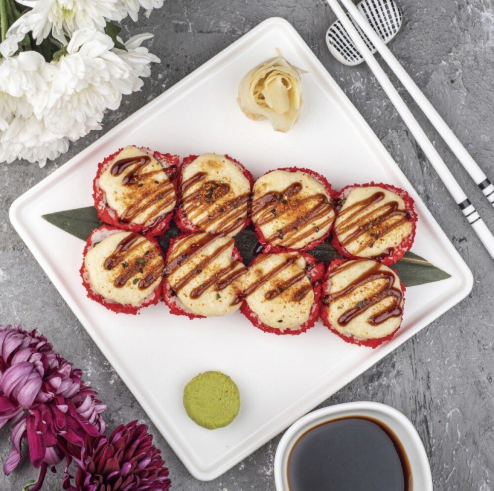 Рис, нори, сыр сливочный, креветки, омлет тамаго, огурец, икра тобико, сырный соус.