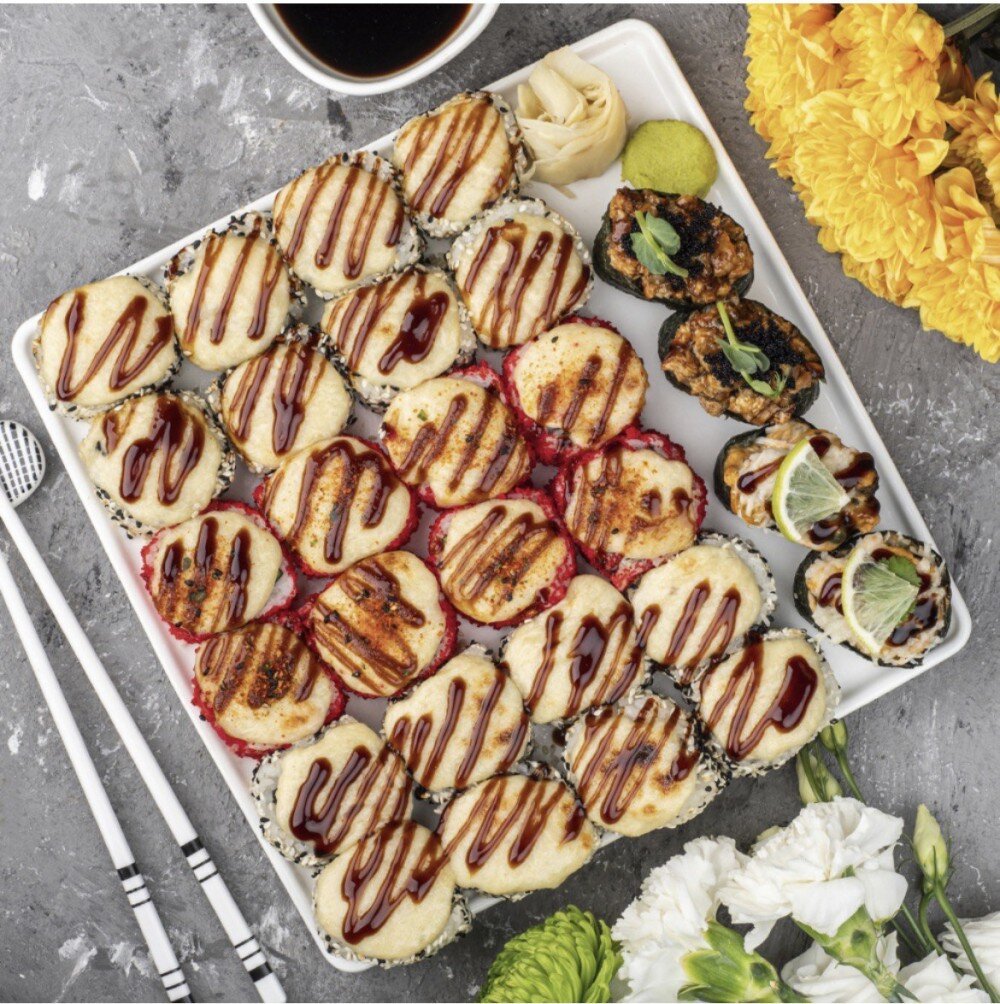 Тёплый ролл Калифорния с креветкой, Тёплый ролл Калифорния с снежным крабом, Тёплый ролл Калифорния с лососем. Гункан сырный с мидиями-2шт. Гункан сырный с курицей-2шт.